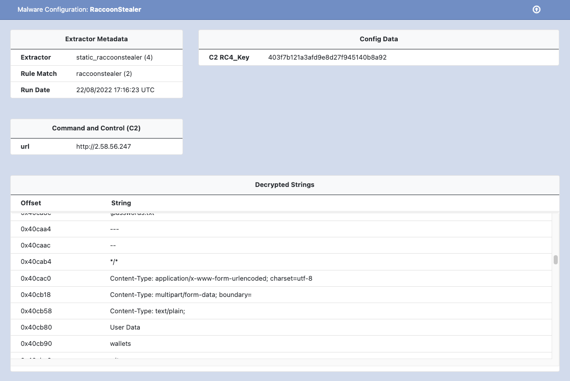 In addition to maintenance work, we've updated a few extractors, such as FormBook and NetWire to improve coverage. We've also deployed a new config extractor for RaccoonStealer (aka RecordBreaker) as shown in the example below.