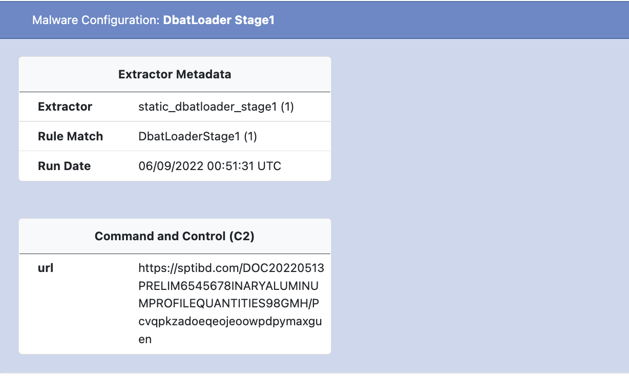 An example of the Dbat Loader config extracted by UnpacMe follows.