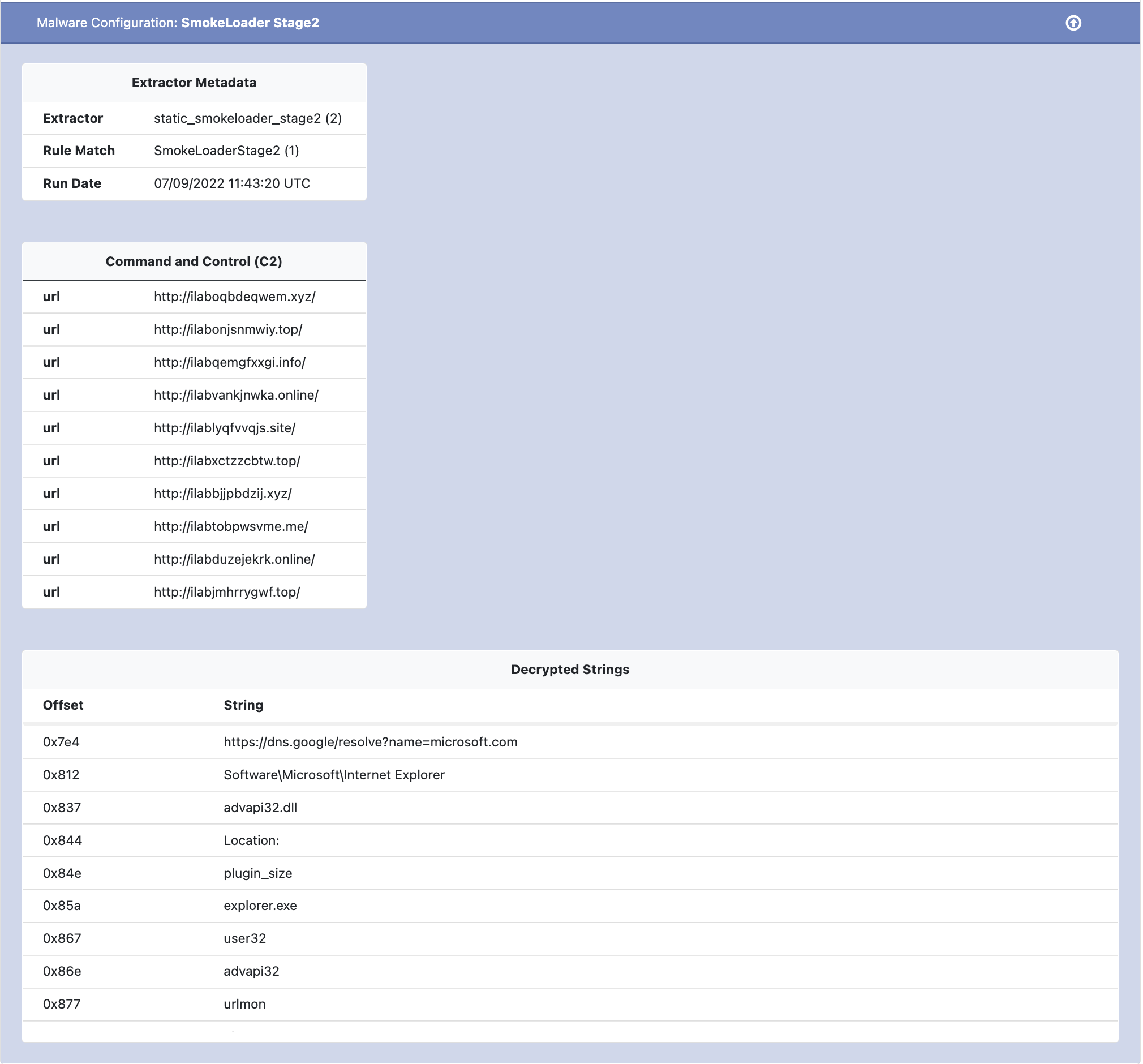 This week we have added malware configuration extractors for SmokeLoader, and DbatLoader.