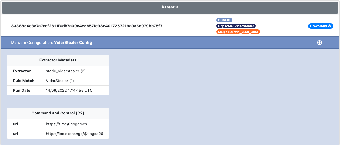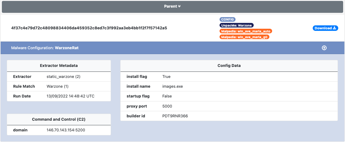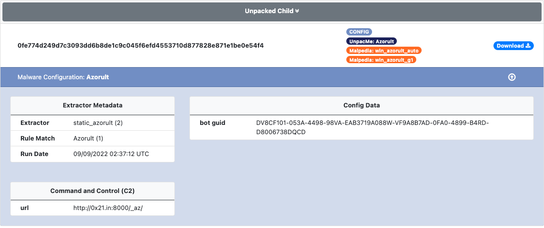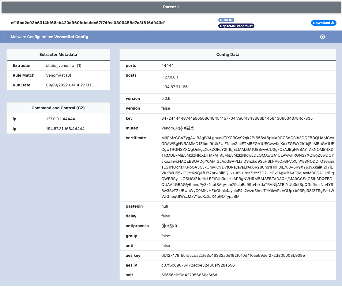 This week we have added config extractors for the following malware families; WarZone RAT, PrivateLoader, VenomRAT, Azorult, Vidar Stealer.