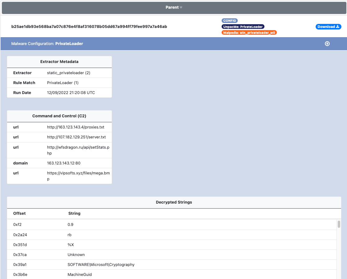 An example of the PrivateLoader configuration extracted in UnpacMe is shown below.