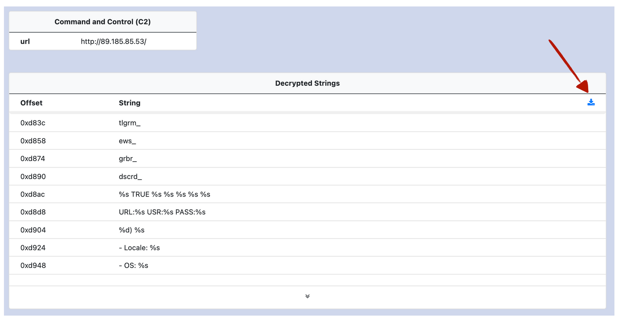 This week we've updated the malware configurations in UnpacMe giving you the option to download all decrypted strings as a JSON formatted file. The new strings download button can be found in the top right corner of the Decrypted Strings table, as shown below.