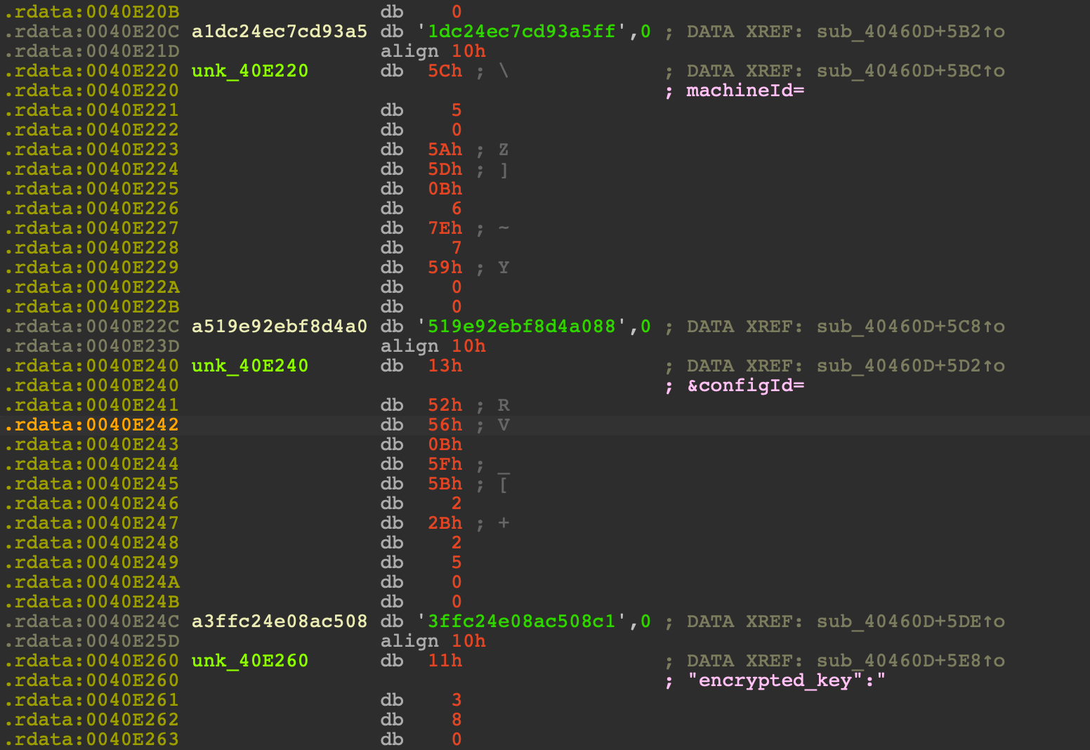 To help analysts use the decrypted string data, we've released a simple plugin for IDA. The plugin will will read a downloaded JSON file and add a comment at each offset with the decrypted string value. An example of the annotated strings for RaccoonStealer malware is shown below.