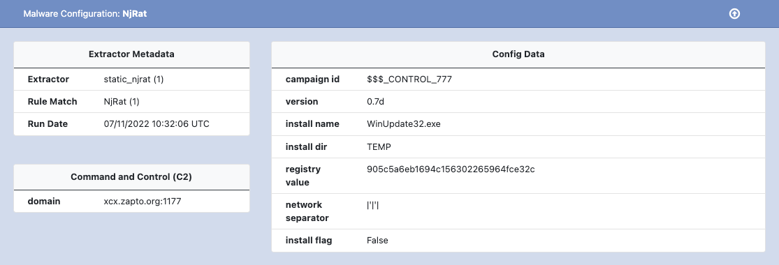 An example of NjRat malware configuration is shown below.