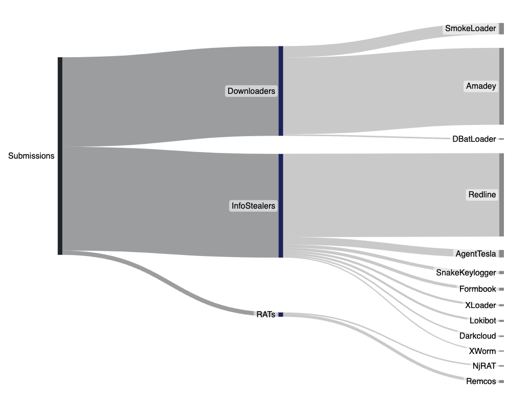 This week Redline and Amadey have remained as the most frequently submitted threats, followed by SmokeLoader and AgentTesla. As noted in recent weeks, we continue to observe Downloaders and Information Stealers as the top submitted threat types. Over the past few weeks, we've seen a decline in Stop/Djvu Ransomware submissions that we saw spike in June.