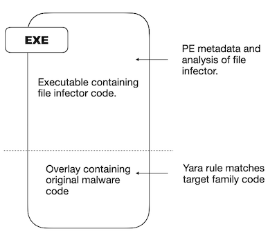 Many file infectors will simply replace the existing executable code and append the old code to the PE file as an overlay or an additional section. When attempting static classification, or automated YARA generation, the classifier may be asserting on string sequences within the original appended data. However, once the file is executed the file infector code is run leading to inconsistent results and inaccurate baselines.