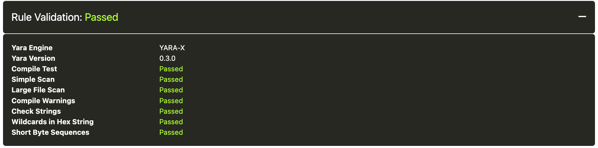 All of our YARA validation tests are now also available with YARA-X. Although the YARA-X project promises 99% rule compatibility with YARA, there are some significant differences that analysts should be aware of. We recommend testing your rules with the engine they are intended to be run on.