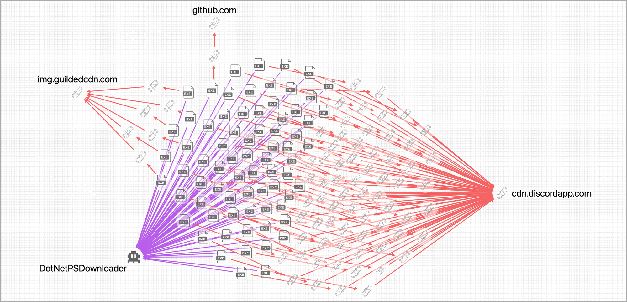 PIVOT also integrates our SourceIntel data which tracks sources of malware. This integration enables PIVOT to track malware distribution trends. For example, PIVOT revealed that the DotNetPSDownloader is primarily delivered via the Discord, and Guilded chat applications, and occasionally via a trojan GitHub repository.