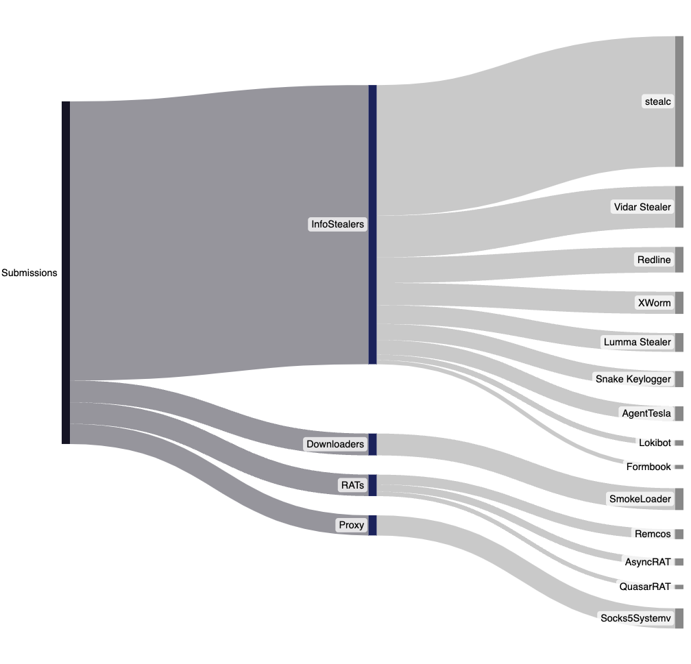 This week, we observed an increase in Stealc and Vidar Stealer submissions, with a continued rise in .NET-based information stealers. UnpacMe’s enhanced analysis now more effectively handles corrupted PE files.