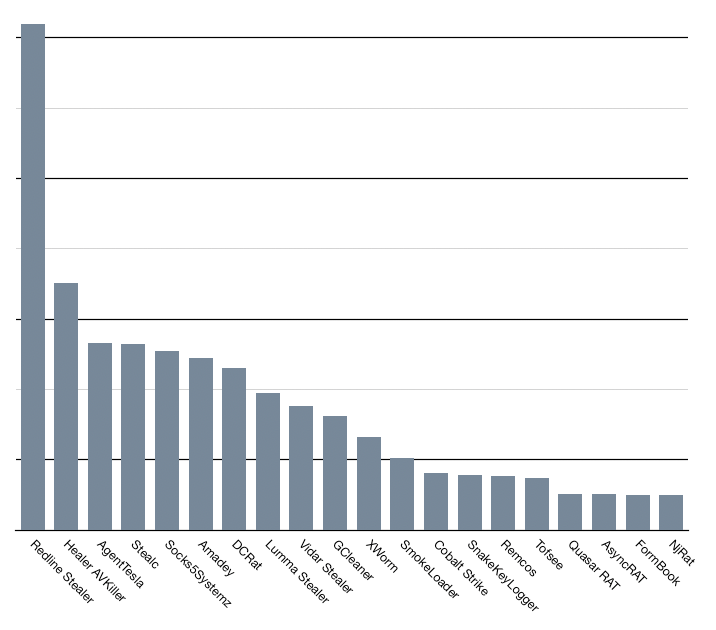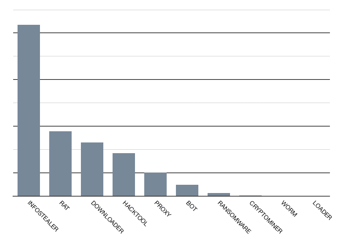 Information stealers and remote access trojans (RATs) remained the most commonly submitted malware, continuing a trend observed in 2023. The rise in RAT submissions appears to be driven by threat actors repackaging leaked and open-source .NET malware codebases with minimal alterations and presenting them as new malware families.