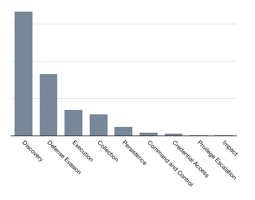 - The most commonly observed MITRE ATT&CK tactics in malware were Discovery (TA0007), Defense Evasion (TA0005), Execution (TA0002), and Collection (TA0009). Compared to last year, we saw fewer families implementing Persistence (TA0003). This is likely due to the rise of Information Stealers, which focus more on data collection and additional payload delivery rather than maintaining persistence.