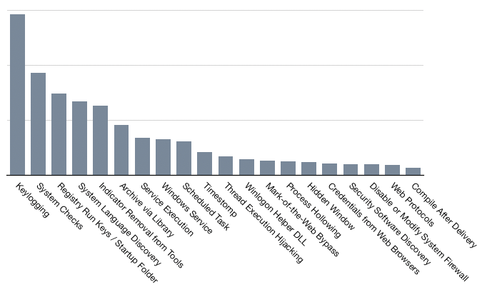 Drilling down into the top sub-techniques, Keylogging (T1056.001), System Checks (T1497.001), and Registry Run Keys/Startup Folder (T1547.001) were the most frequently observed. Similar to last year, Indicator Removal from Tools (T1027.005) and System Language Discovery (T1614.001) also remained common techniques.