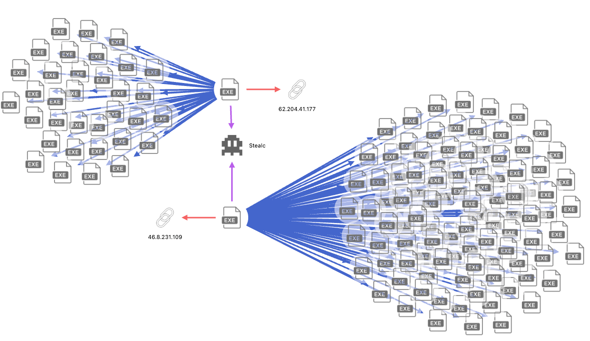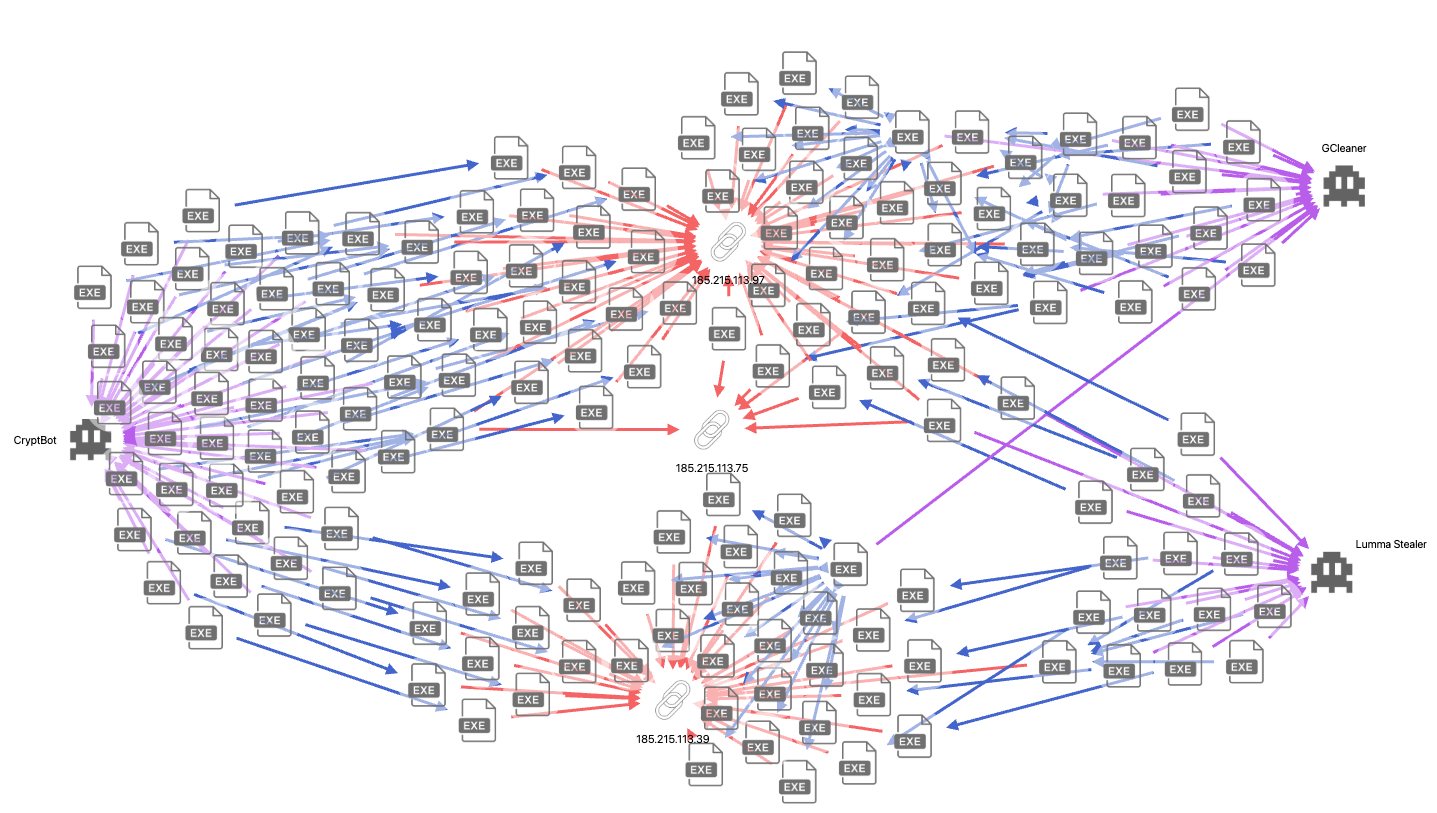 Threat actors continue to rely on inexpensive VPS providers for their operations. In 2024, we once again observed AS44477 (Stark Industries) and AS9009 (M247), both of which were identified in our previous analysis. Additionally, AS51381 (EliteTeam), a known malicious network, remains active in facilitating malicious C2 and malware distribution activities. We also examined source data from our SourceIntel collection and tracking provided by our partners at LIA. The pivot diagram below illustrates an example of AS51381 being used to distribute multiple malware families across a set of IPs within the network.